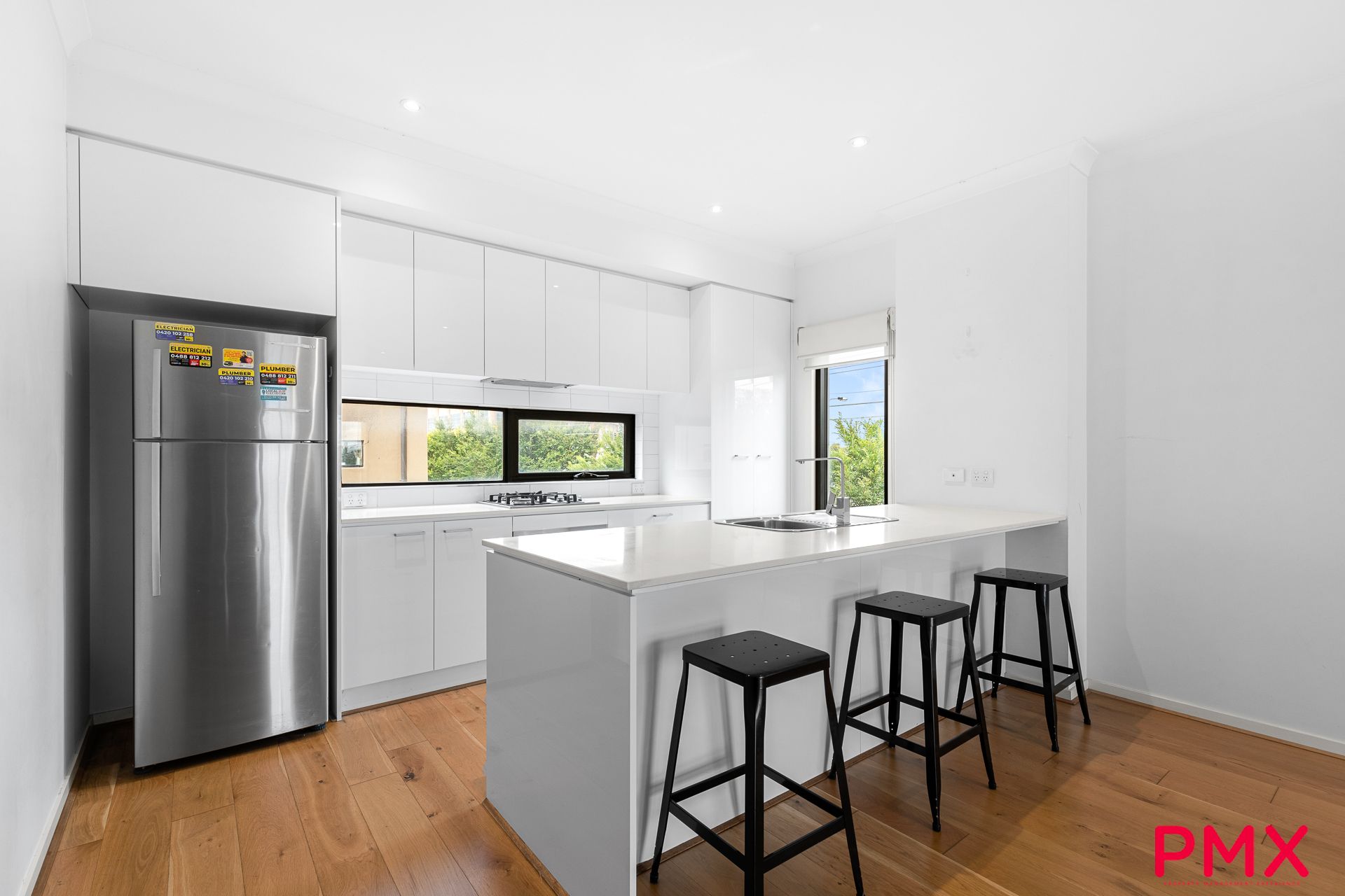 - Contemporary, fully appointed kitchen with long stone benchtop, stainless steel appliances including gas cooktop, electric oven and dishwasher